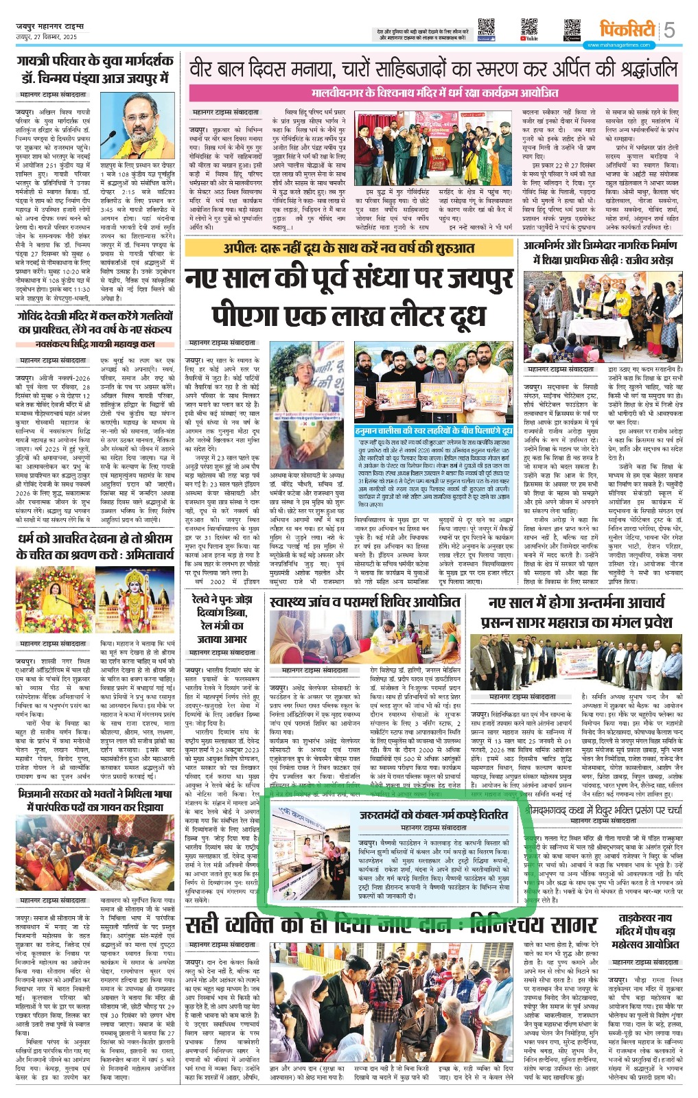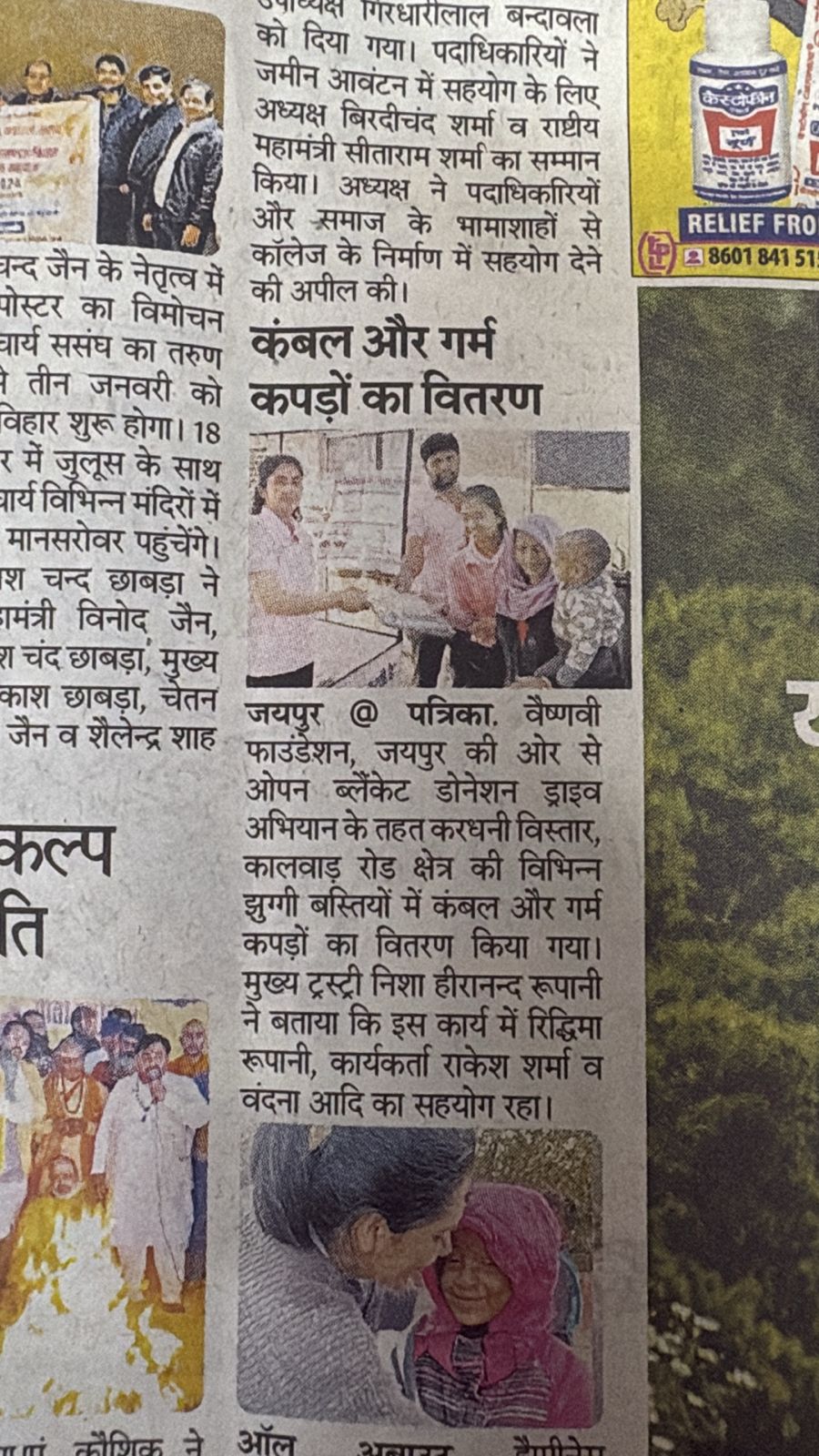 9.दिनांक 26/12/2025, शुक्रवार को वैष्णवी फाउंडेशन, जयपुर के तत्वाधान मे अपने द्वितीय “ OPEN BLANKET DONATION DRIVE” पहल के तहत करधनी विस्तार, कालवाड रोड, जयपुर