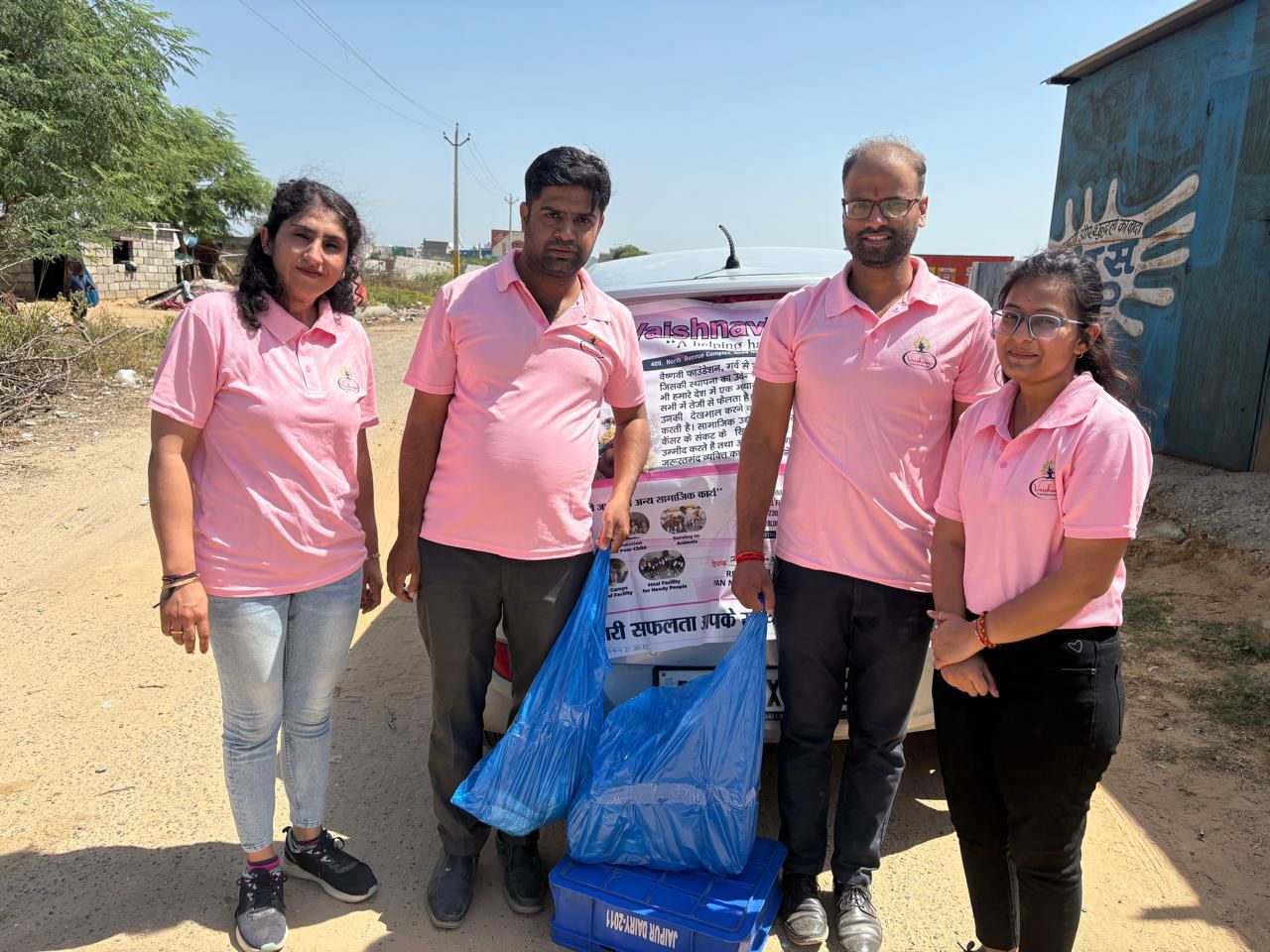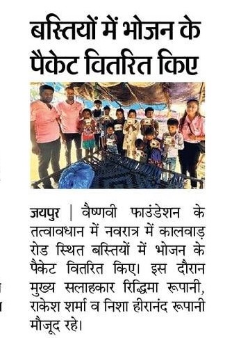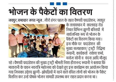 दिनांक 26/09/2025, शुक्रवार को वैष्णवी फाउंडेशन, जयपुर के तत्वाधान मे अपने “ZERO HUNGER ” पहल के तहत कालवाड रोड, जयपुर, स्थित विभिन्न झुग्गी बस्तीयो में सार्वजनिक रूप से भोजन के पैकेटो का वितरण किया गया जिसमें फाउण्डेशन की मुख्य सलाहकार/ ट्रस्ट्री श्रीमती रिद्धिमा रूपानी, कार्यकर्ता श्री राकेश शर्मा, श्री मनोज सोनी, सुश्री वंदना आदि मौजूद रहे।